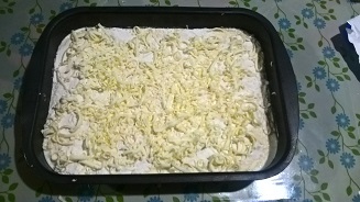 Самый верхний слой у Вас получится из смеси для кексов, на него трем на крупной терке примерно полпачки сливочного масла (сначала масло заморозить, легче будет потереть).
