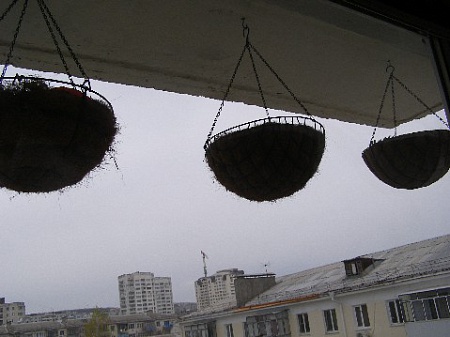 У меня уже третий год висят, надеюсь не последний Диаметр кашпо 40 см, после полива очень тяжёлые. В потолке просверлены дырки, вбиты пластиковые чёпики и вкручены в них специальные крючки с резьбой. Пока т-т-т висят, выдерживали очень сильный ветер.