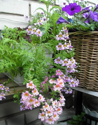 Вита, так ведь он прав! Ведь обвешаешь. И обвалится! Сочетания всякой цветочной мелочи с петуньками - это у меня пунктик, конечно. Но у меня так буйно петуньки не цветут, как у тебя. Для меня брахикома, лобелия, алиссум, дихондра, цинерария - это заполнение дыр в кашпо, когда петуньки перестают цвести или после стрижки отдыхают. Не думаю, чтобы для тебя это было актуально Да и калиброхи на твоем балконе отлично работают "цветочной мелочью", разбавляют плотный петуниевый массив. К твоим мощным петуниям ничего и не подсадишь - задавят. Только если в отдельные емкости, но это неудобно. Или к кустовым петуниям- бока ящиков закрывать. В этом году попробовала как партнера схизантус. Ой, прелесть какая оказалась! В следущем году обязательно его с петуниями замешаю. Он растет интересно: сначала падает вниз, а соцветия потом растут вверх.