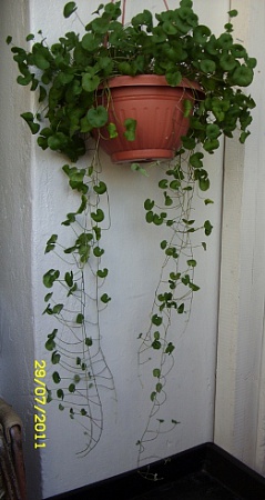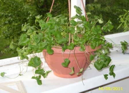 Я тоже позарилась на фотки водопадов дихондры и весной посадила с петунией (композиция, замечу, мне не особо понравилась, то ли дихондра еще не достаточно разошлась, то ли петунь неудачная для композиции была). За лето выросли плети 50-60см, месяц назад обрезала до 20 см, чтобы сэкономить место. Зимует прекрасно.