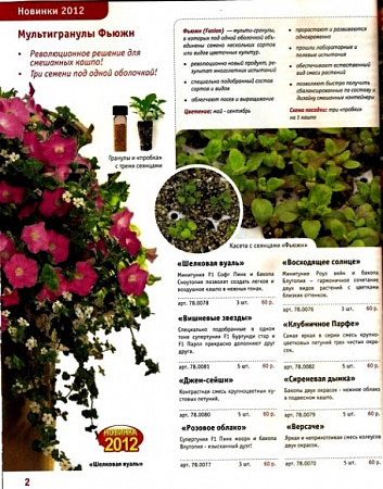 Сегодня прочла в каталоге РО о новинке-мультигранулах Фьюжн. В продаже пока таких гранул не видела. Но интересно. В упаковке 3 гранулы и в каждой грануле по 3 шт. семян. Эти гранулы предназначены для создания смешанных кашпо. Отсканировалась страничка не очень хорошо, но при увеличении можно разобрать состав почти всех смесей. Я вот подумала: а что если попробовать посеять таким же образом в таблетки...