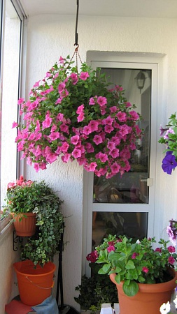 Девочки помогите принять решение. Стоит ли заменять центральный метровый ящик с синим изиком (и две бомбочки под ним с гиант блу) на сурфинию хот пинк? Причина - снизу растения на шестом этаже сливаются с фасадом балкона(((