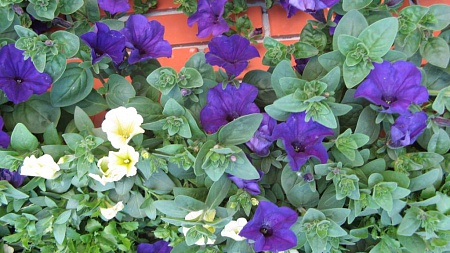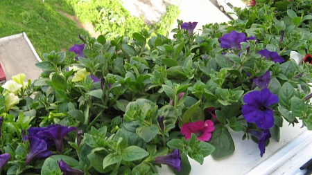 И вот ящик, который снизу не имеет вида (хотя сверху очень даже ничего))) ). В ящике два изи вейв блу, одна табл еллоу, одна растберри балст (без прожилок) и одня гиант прапл + лобелия (пока подстрижена). Обратите внимание - изик уже закрыл ящик и почти дорос до бомбочек. Если честно - мне жаль их трогать(((