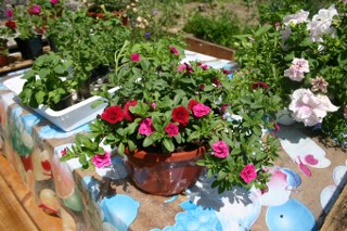 и еще не знаю кто такой но люблю его очень, в прошлом году куплен черенком, благополучно перезимовав имеем такую вот растень с махровыми цветочками крупнее калибры мельче петуний, для сравнения поставила цветочек калибры, это одно растение в 23 кашпо.