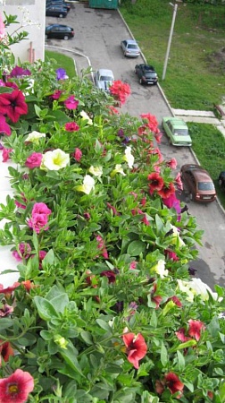 Покажу, что у меня сейчас... Специально сбегала в подъезд, пока солнце из-за тучек вышло)))) Вот что видят мои соседи. Это северная сторона балкона, цветов пока мало и те немногие, что были я поудаляла после вчерашнего сильного дождя(((