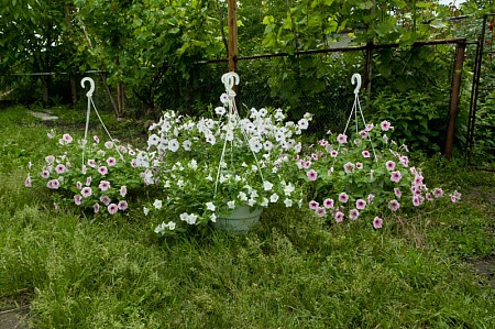 Девочки, вот здесь многие говорят об обьемах для петуний и сурфиний. Знаете, 4 года експериментов моих доказали, что надо учитывать не только обьемы, но и условия роста. Для улицы все понятно - тут на обьем надо ставить акцент. А вот с балконом - все по-другому. Путем проб и ошибок я поняла, что на моем застекленном западном балконе идеальный вариант - загущенные посадки. Никогда у меня с одной сурфы на 5 л. горшок не получался нормальный куст. По-этому уже в этом году посадила все сурфы по 3 шт в подвес (в прошлом году на пробу одно или два кашпо так сажала). Так что можете закидать меня тапками, но я считаю это правильным. Конечно, поливаю каждый день, в жару буду по 2 раза, кормлю в каждый полив. А пересадить в горшки побольше при необходимости всегда можно (не исключаю, что есть сорта, которые попросят пересадки в сердине лета, но далеко не все)