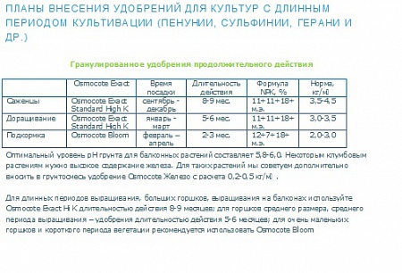 алианда, вот слямзила информацию с другого форума: 11+11+18+2MgO+Micro 5-6 мес. Для растений, которые нуждаются в высоких дозах калия. Для многолетников и однолетних культур с длинным периодом вегетации. 15+09+12+2,5MgO+Micro 5-6 мес. Использование апрель-май. Для хвойных , сезонных цветов, лиственных. Норма внесения: 3-5 кг/м3.