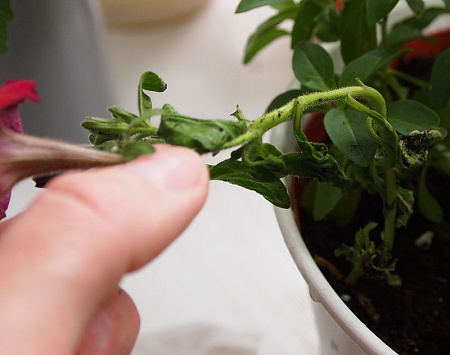 Пришла плакаться, у меня проблема с одной из ампельных петуний, и как назло с той самой, пурпурной (фотик перевирает в красный), на которую я запала. (Вторая в горшке оказалась белой, тоже хорошенькая, но та - просто лубофф с первого взгляда , а третья пока без бутонов.) Петунии у меня 2 дня .Проблема в том, что листья висят тряпочками - все, кроме только что проклюнувшихся, потом они подрастают и тоже вянут и только у пурпурной. Побег зеленый, нормальный, есть новые почки. Один цветок был распустившийся, одни бутон - бутон подрос. Когда покупала, проблема с листьями уже была, с тем только отличием, что верхние листья еще имели тургор. Т.е., похоже, проблема с поступлением воды - либо корни (при пересадке особо ком не дербанила, но ничего плохого не увидела, белые корешки), либо побег (на фото красная стрелка) надломился в месте прикрепления к основному побегу и плохо проводит воду. При пересадке обрезала все увядшие листья и мелкие побеги-доходяги, обработала от клеща, т.к. были небольшие следы его присутствия. Цирконом тоже (ну, привычка у меня такая, мне нравится ) Но вот те листья, что были нормальными, тоже повисли... Что делать? Очень хочется сохранить растень. Попробовать отчекрыжить в и укоренить? Если я еще подожду несколько дней, понаблюдаю, должно ведь стать либо лучше, либо хуже - если хуже, то укоренится такой подвяленный черенок?