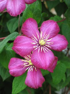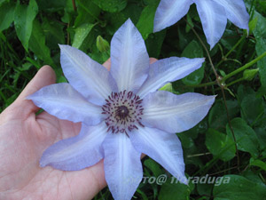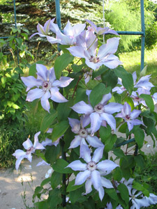 Есть у меня клематис "Негритя(ё)нок"- так он убегает по яблоне и не видно его цветет в кроне.