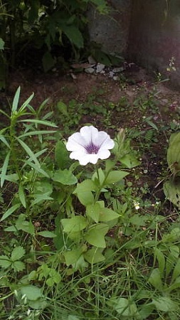 Нашла вдруг в траве петунью, откуда непонятно, третий год уже их не выращиваю, тем более в открытом грунте.