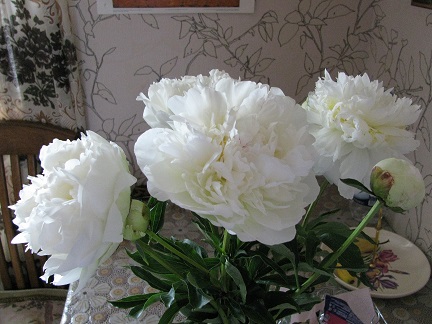 пион белый слева махровый позднего срока цветения, бутон был острый в форме пирамидки салатового цвета.