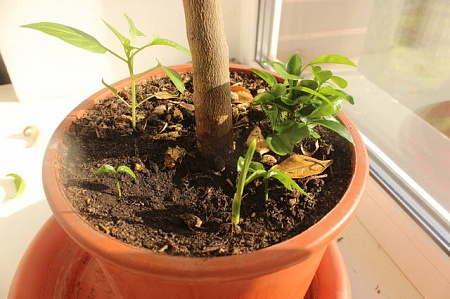 Похоже сладкий, болгарский. А самое интересное, посей я сама семена в октябре, вряд ли у меня чего порядочное выросло, а тут такой крепенький и коротенькие междоузлия, и всего-то ему хватило, и света и питания.