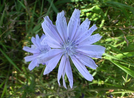 Цикорий. Из форумных, вроде, Зоя его специально сеяла У нас все дороги проселочные в нем. Хотя... наш, может, не съедобный... Гы. Хотя и зоин, насколько я понял, - тоже