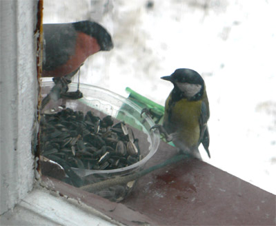 Инна, на даче, где могли бы снегири и чечетки прилететь, кормушка неподвижная, целый стол им выделила. Пасутся там большие синицы, черноголовые гаички, пухляки и поползни. А вот когда-то на березе семена лущила целая стайка чечеток, под березой стол с семечками, так они не соблазнились. И снегири равнодушно пролетали мимо. Как я их только не уговаривала, не слушали.