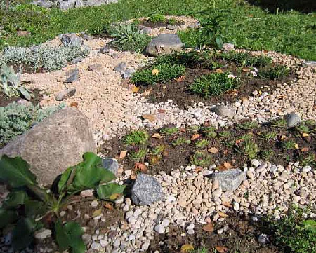 Кусочек гравийной клумбы с разрастающимися растениями.