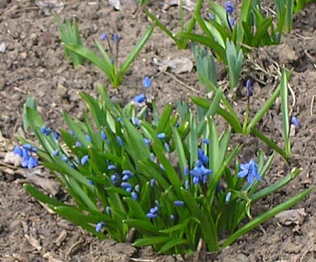 Это хионодокса. Интересно цветет: по одному цветку на ножке. У моей по несколько на цветоносе. Но когда все цветы распускаются, то ложатся на землю. По одному лучше.