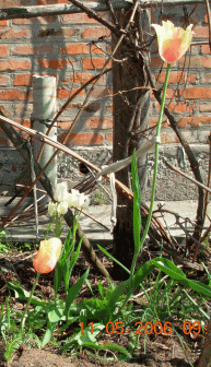 Фото следующего года: восемь колес, обложенных камнями. В них цветы посажены уже отдельно. В двух колесах бархатцы, в одном вижу матиолу, которая воняет по вечерам. В детстве терпеть их не могла. В двух колесах торчат корявые палки, видимо предполагалось, что по ним будет расти ипомея. Наверное еще мала была. Хорошо, что есть фотографии.