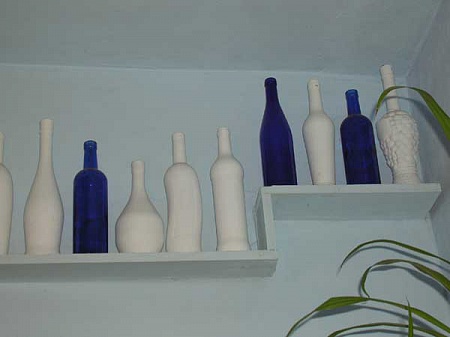 Бутылки покрашены акриловой краской белой, а синие такие и были. Кухня у меня бело-голубая. А они на кухне под потолком.