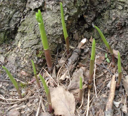 Ландыши выпускают стрелы листьев. Это фото сделано в леочке по дороге от Калужского шоссе к нашему городку (метрах в 10 от городской улицы). А вот дачные ландыши не сфоткала...