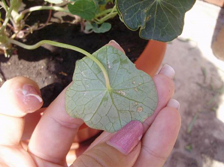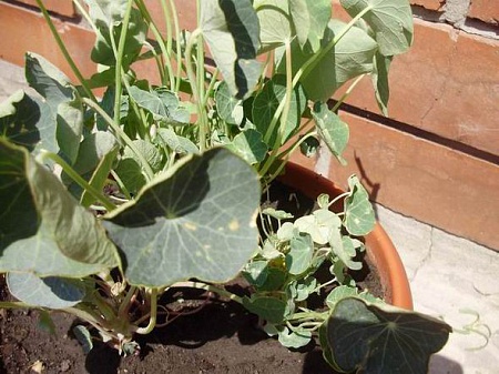 Подскажите, пожалуйста, что нужно сделать, чтобы у настурции, растущей в балконном ящике были нормальные большие зелёные листья, а не недоразумение с ноготок. Причём цветёт она вовсю.