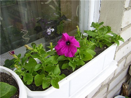 У меня тоже зацвела первая петуния"мираж пикоти" от Аэлиты,красивейший ярко-красный цвет с белой каймой и всё.Все стоят с бутонами,но толку никакого-холодно.