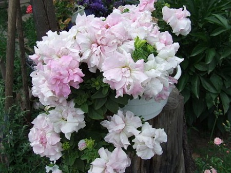 Остальные - ампельных признаков не проявляют. Как и Синий водопад. Куст у них получается большой, пышный, прикрывает емкость и как бы вываливается черехз край. Считать ли это за проявление каскадности? По мне - это не ампели.