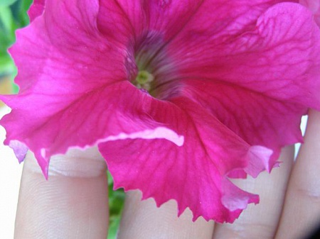 Ещё большим удивлением у меня было то, что на одной петуньке, которая растёт в одном ящике с фрилутунькой, вдруг начали появлятся кружевные края. Эта единственная петунька, которую я купила, но она была совершенно простая, ярко-розового цвета... А теперь несколько цветочков стали вот такие. Для меня это ещё большая загадка. Это бутон.