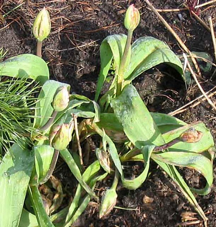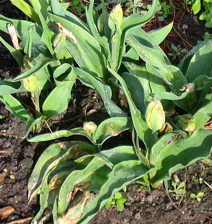Что-то у меня проблемы с тюльпанами. Зима у нас была теплая, они еще в феврале повылезали, а в апреле уж 3 раза заморозки были...Эти тюльпаны были посажены в прошлом году (цвели супер), летом не выкапывал... Этим летом всех выкапаю...Меня интересует: из-за заморозков это или какая-нибудь болезнь грибковая? Я понимаю, что луковицы голландские и им нужно сначала к моим условиям приспособится, но такого у меня еще не было...У некоторых моих сортов такого нет и у новых осенью посаженных тоже...Спасибо за ответы...