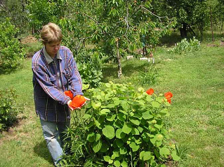 Да не очень удачно просто сфотал, не видно всей красоты... Вот жена обнимает маки (на заднем плане условно созревшая молодая черешня):