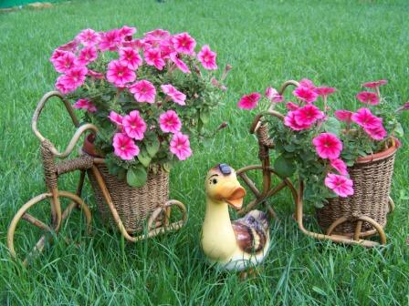 А петуньевый велосипед на фоне изумрудной травы вообще отпад!!!(утенок немного нарушает картинку,но это на мой взгляд).