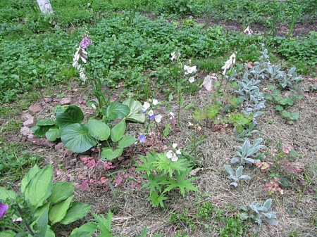 у меня пока много голой земли, а попробуешь чего-нибудь куда-нибудь воткнуть, напорешься или на лилии, или на гейхеры (посадила аж 16 корневищ), недавно нужно было посадить три аквилегии Nora Barlow, несколько традесканций Bilberry Ice, три лабазника Plena, так только после нескольких попыток удалось найти местечко, клумба служит еще и разводочной грядкой сейчас три сорта гейхер и пара астильб вынужденно дома подрастают вчера купила 4 сорта анемон 20шт по 3р и сирень мисс Канада - это на левую сторону