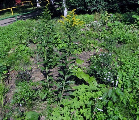 Неопознанный кустик оказался золотарником, прямо солнышко. Соседка на него что-то ополчилась - злостный сорняк. А мне нравится: весь такой жизнерадостный и цвести будет до самой поздней осени. Пожалуй, оставлю. Только отцветшее надо будет своевременно срезать, а то семена летучие могут всё забить.