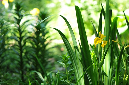 Болотный ирис на фоне лилий