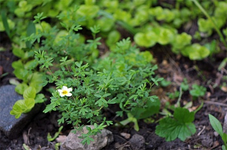 Первый цветочек лапчатки - не ярко-жёлтый, а такой приглушённый, почти белый. Завтракающую мушку сгонять не стала.