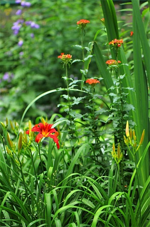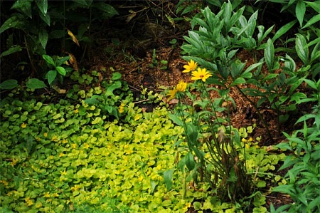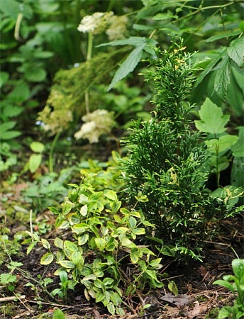 Может быть, ошибки в агротехнике могут так сказываться. Olga_A, бузульнику требуется много места - у него куст метр с лишним в диаметре. Так же необходимо место для осмотра: чем больше габариты растения - тем с большего расстояния на него надо любоваться. Потому на моих площадях он очень выигрышно смотрится Кустики лилейника распускают по одному цветочку в день, так что пока красоты нет. Надо дождаться разрастания, чтобы было побольше цветочных стрелок. Бересклеты приживаются по-разному: в тени стоят огурцами, на солнце отсушили почти все листья, но почки живы, один вид полностью заплела-закрыла собой вероника. Но ему там хорошо, он прикрыт от солнца и во влажной среде. В тени рядом с туечкой. Сеянец клёна так глаза и мозолит, хочется скорее выдрать.