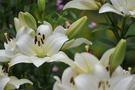 Пускай ими подавится, чтобы её от жадности разорвало. А у тебя ещё краше и лучше нацвело. Наконец, могу показать свои лилии. купленные по твоей наводке. Мне повезло, они оказались все одинаковые, рослые, статные, с приятным ароматом (не душные), цветки как фарфоровые, т.к. не чисто белые, а цвета слоновой кости. Сейчас - они центр всей композиции. Рядом с ними - столь же высокорослое розовенькое нечто. Убирать скорее всего не буду, т.к. маскирует лилии, пока в бутонах, а когда цветут - приятно оттеняют. Сегодня покажу белое и красное