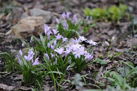 У меня хионодоксы тоже разрослись, Меня радует как они быстро набирают массу. А вот пушкиния наоборот стала мельче. Вчера вышла покопаться. Для прикрытия взяла своего кота, т.к. разрешено выгуливать домашних животных. Животное сильно сопротивлялось, и природа смилостивилась над ним, почти сразу потемнело и пошёл снег. Пришлось идти домой.