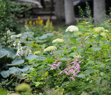 Зацветают первые астильбы, расцвела гортензия древовидная, соцветия пока совсем молодые. Весной состригла их на пень без сожалений. Шапки обещают быть крупными, надо подкормить калийными удобрениями, чтобы не падали.