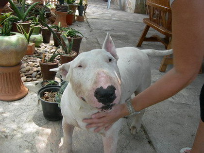 А этот бультерьер живет у наших друзей в Аютайе. Вроде серьезная собака. Но душу продаст, если его почешут за ушком.