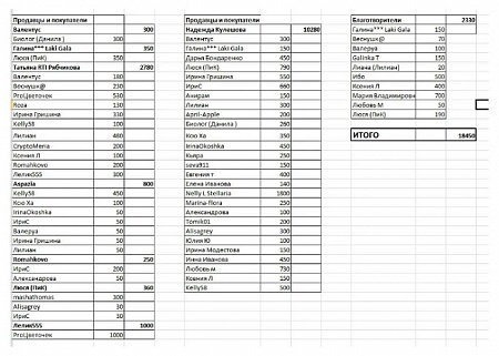 Ульяна 50 Елена Смирнова (из ТК) 50 Надежда Сергеевна 900 Татьяна RTI (из ТК) 100 Мария (из ТК) 100 Natalia Kirichenko (из ТК) 200 Марина Kindwitch (из ТК) 300 tepla 200