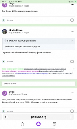 Вдруг получилось с телефона войти на форум! ( В последнее время это не получалось, а на даче ничего другого нет). Попробую загрузить отчёт за среду 3.09.25. Огромное всем спасибо! Надежда Сергеевна и Дарья регулярно публикуют в Телеграм отчёты и рассылают деньги в ПиК. В эту среду деньги уже отправлены в темы собак из Машинского приюта, а также коту, аокусанному собаками, коту из приюта "Коготь" куратору Дине Кулаковой, коту Изе. Попробую позднее дать ссылки на эти темы. Обычно меньше получается, тут просто совпало, наверное, что к 1 сентября бабушки подтянулись. Да и опять разъехались. Спасибо всем, кто не бросает бездомышей! Кураторам сейчас туго приходится. Помощи мало. Долги растут. Что- то не получается внятно отчёт перенести сюда. Буду пробовать.