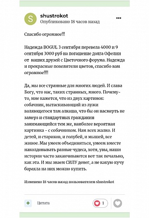 Прошу прощения за такие ошибки. Отчёт тут уже продолжу. В теме приютской собаки Офелии вот такое сообщение о том, что Надежда Сергеевна перевела от нашего форума собранные у головы деньги. И о том, что волонтеры от души Вам благодарны.