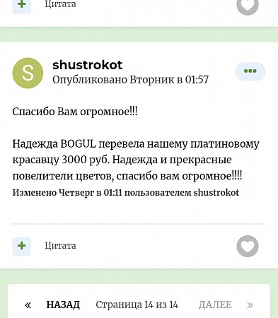 Дорогие друзья! Наши постоянные благотворители ( это наша цвето*ница Ирина (её ник КисП) и её муж Сергей пере*ислили мне 5000 р для помощи бездомышам. Ирина, Сергей ! Спасибо Вам огромное!