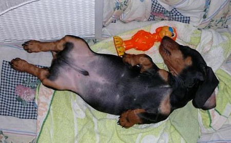 Filaria, Здорово, что выздоровел! У меня год назад умер прежний такс, ему было 11,5 лет (гонялся за кошкой во дворе и под стоячей машиной головой обо что-то стукнулся в пылу погони).Диагноз - субдуральная гематома. Трепанацию у нас собакам не делают, умер за сутки.До сих пор душа болит - не уберегла... Вдруг оказалось, что без собаки мы жить не можем. Взяли мелкого (1 мес). Нянчили, как могли, ростили... Вырос слоник. 5.11.08 ему будет 1 ГОД!!! Зовут Бакс. Тут ему 1 мес