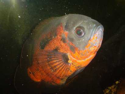А это рыб -красавец -астронотус.Ему 6 лет.Живет один,так как характер неуживчивый.Да и размеры солидные - 30 см.