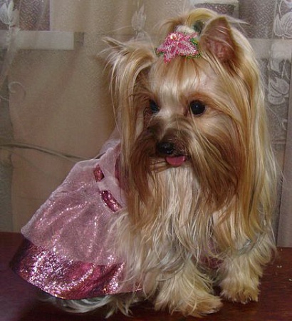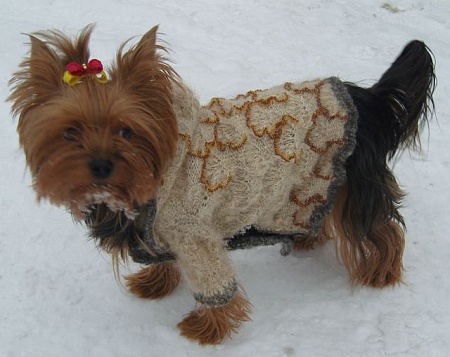 Свадебное платье вручную расшивала целый день, с утра и до шести вечера.К одежде собака привыкшая. Стараемся покупать фирменные вещи, но иногда носим и свои произведения. Специальные носочки с кружавчиками и порезиненной подошвой, чтоб не скользили.