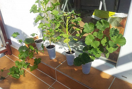 Всем привет! Вот мы и перезимовали. Это осенние черенки - были небольшие, но за зиму здорово выросли... Тут 4 разных сорта и цвета. Слева направо: плющелистная, королевская, третий забыла - там цветки как звездочки... (розовые, см.фото мамы черенка) и зональная.