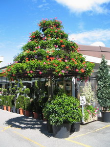 а это гераниевое дерево, перед входом в гарден центр. Там обычный каркас с кольцами различного диаметра, к которому по кругу и крепятся ящики с геранями.