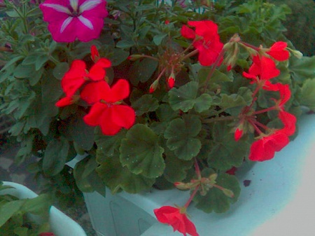 Nat (МО)! Я в этом году тоже стала обладательницей балкона и впервые выращивала за окном цветы в ящиках. И вот что хочу сказать. Вашей ошибкой, на мой взгяд, было то, что Вы разместили гераньки в горшках, а не в земле! Я посадила их прямо в землю, и только саму поверхность вылажила керамзитом (вымостила), чтобы не брызгалось при дожде. Сажала я тоже Люстру розовую ( из семян вырастила череночек и не без боязни определила его в ящик, т.к. на подоконнике место освобождала для особо ценных сортов), Хоризон Ред (посев в январе), Звезду Подмосковья (тоже посев этого года), Сиреневую плющелистку Водопад лета и Райпл- это из семян. А укорененными черенками у меня были Альбина и плюшка Tomcat. Вот что хочу сказать: в отличие от дублей, растущих внутри балкона, в ящиках герани стали плотные, коренастые, пушистые, румяные, цвели, как сумасшедшие, несмотря на плотное соседство с петуньями и некоторыми другими цветами. Прищипывать мне их даже не пришлось! За окном их дубли тянулись, утонщались, ленились выдавать цветоносы( Альбина-всего 2 за лето), а эти горели цветочками, пока петуньки набирали бутоны.Причем отмечу, что посажены в ящики они были достаточно поздно -конец мая- начало июня, а последний ящик- в июле - муж подвел с кронштейнами! Да, после дождя немного хуже - теряется экстерьер цветоносов, немножко портятся и листочки, но быстро приходят в норму, цветы вообще можно оборвать, быстро нарастут новые.Но тут я думаю от лета все зависит - все-таки в этом году сезон дождей получился коротким. К сожалению у меня сейчас нет шнура и я не могу показать сегодняшние фотки, а вот более ранние и те, что во время дождей были сделаны показываю. Хоризон ред, потрепанная дождем, видите - 5 цветоносов, а это один сеянец всего (кстати, на работе его собрат, стоящий на северной стороне, даже и не думает пока цвести)