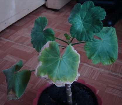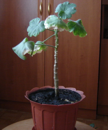Здравствуйте, уважаемые форумчанки. Помогите понять, что за напасть у моей герани. Растет уже год, но очень хилая, хотя стоит на юго-восточном хорошо освещенном окне. От палящего солнца притеняю, потому что на листьях появляется темный ободок, как ожог. В том году скудно цвела. А сейчас нижние листья закручиваются вниз, желтеют по краям и отваливаются. Ствол оголяется. Не заливаю, не пересушиваю. Помогите, что это? Фото прилагается.